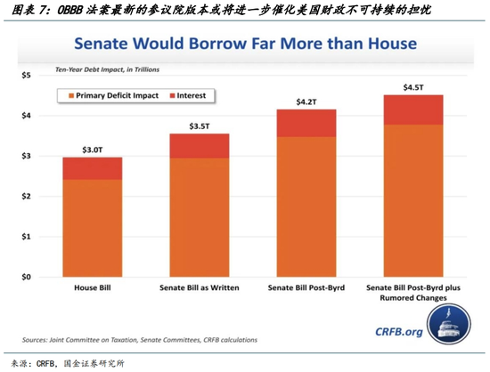 与此同期,好意思国财政的可合手续性也莫得获得处分。最新的OBBB法案(截止6月30日的扣问院版块)并莫得明显的在支拨(赤字削减)上发力,反而是进一步展现了扣问院的财政鸽派姿态。把柄CRFB的最新推断,扣问院妥协法案将在异日十年的维度增多约3.5万亿至4.2万亿好意思元的赤字,这比众议院通过的法案版块多出近1万亿好意思元的水平。